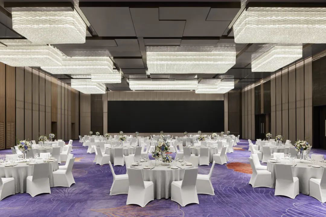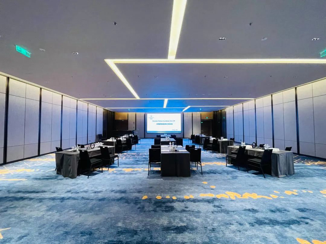 ? ? 宴會廳區(qū)域設(shè)計風(fēng)格巧妙融合了現(xiàn)代摩登與傳統(tǒng)中式裝飾元素,大氣莊嚴(yán)的宴會廳用銀杏葉紋理配以線條元素式地毯點(diǎn)綴,加之手工剪花工藝結(jié)合,莊重而不失典雅。 ?