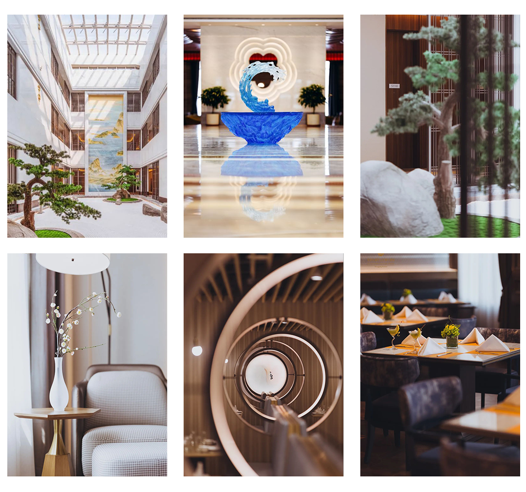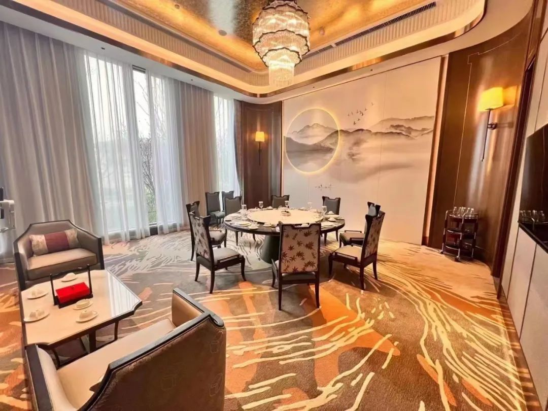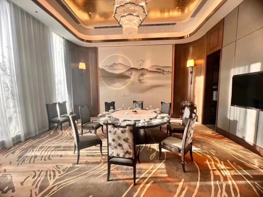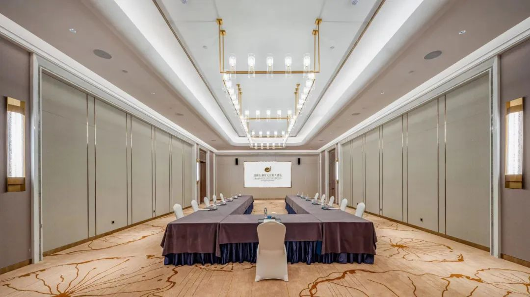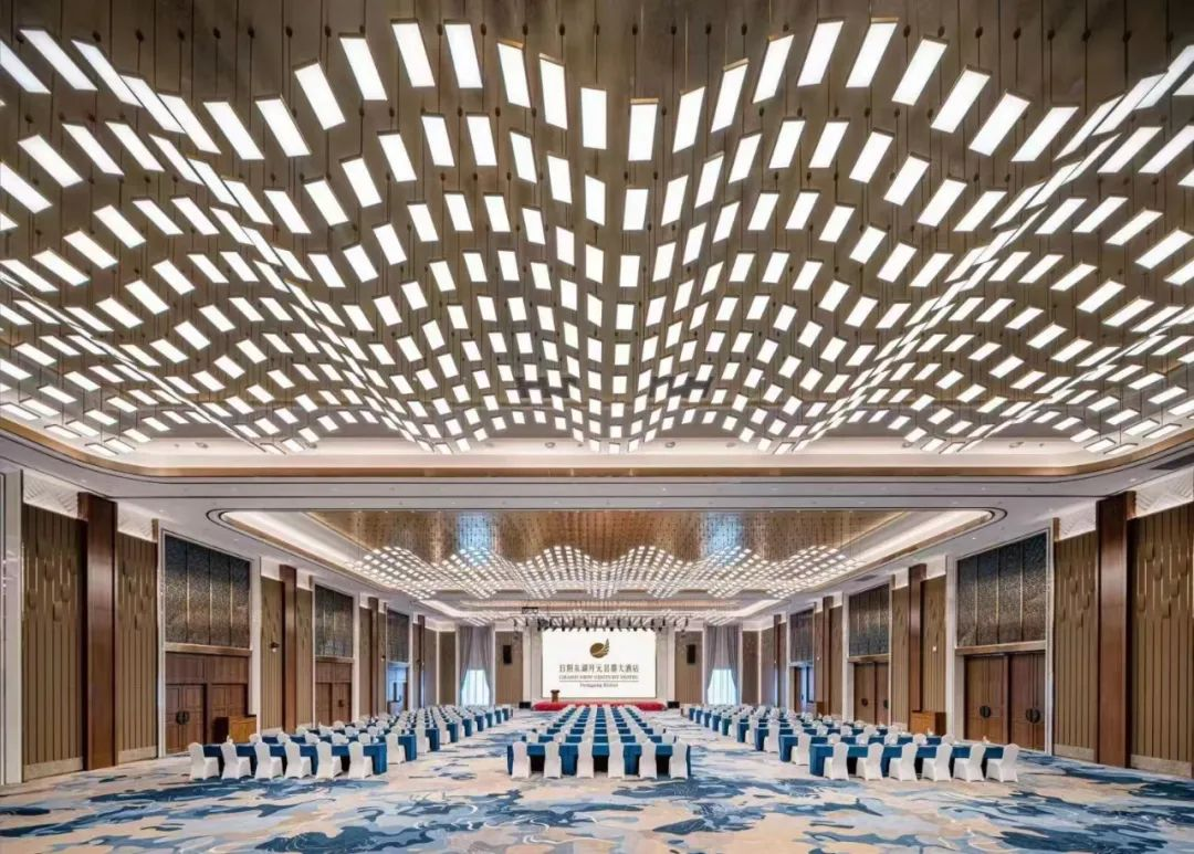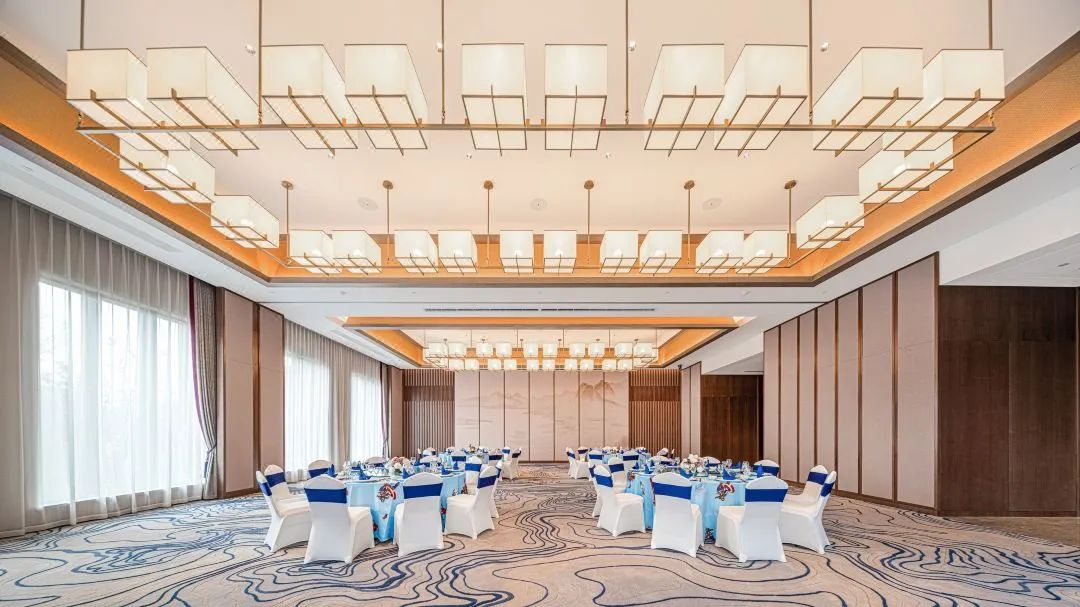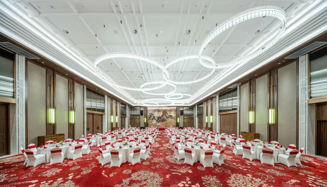 ? ? 該空間以藍(lán)灰色調(diào)的地毯加以襯托,通過(guò)祥云云紋表達(dá)云之靈動(dòng),以現(xiàn)代極簡(jiǎn)代入中式元素的雙向結(jié)合,既保障了宴會(huì)時(shí)的輕松愉悅,又符合大型會(huì)議時(shí)的大氣莊重。