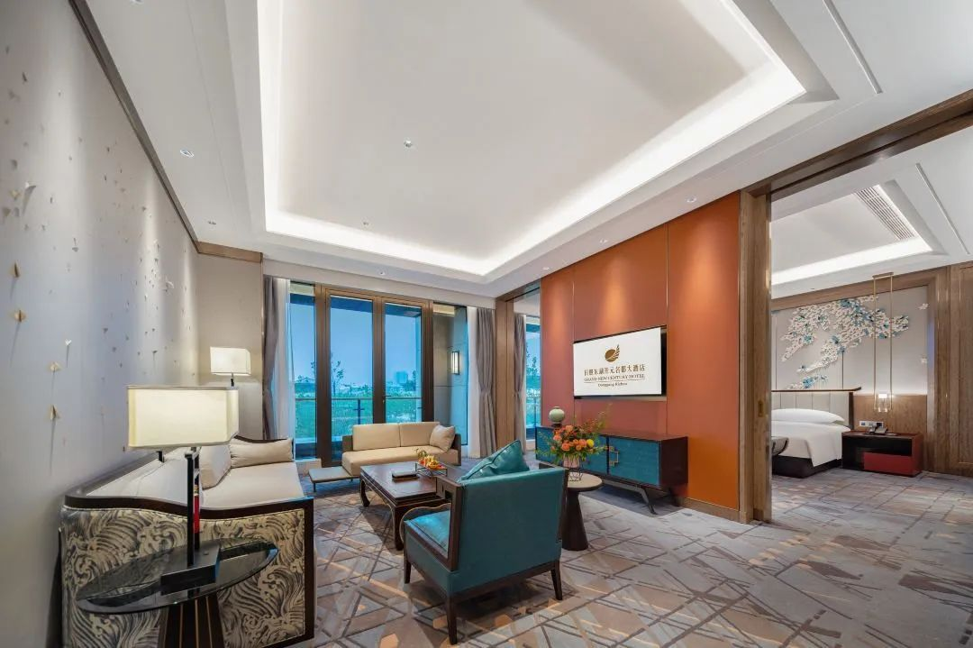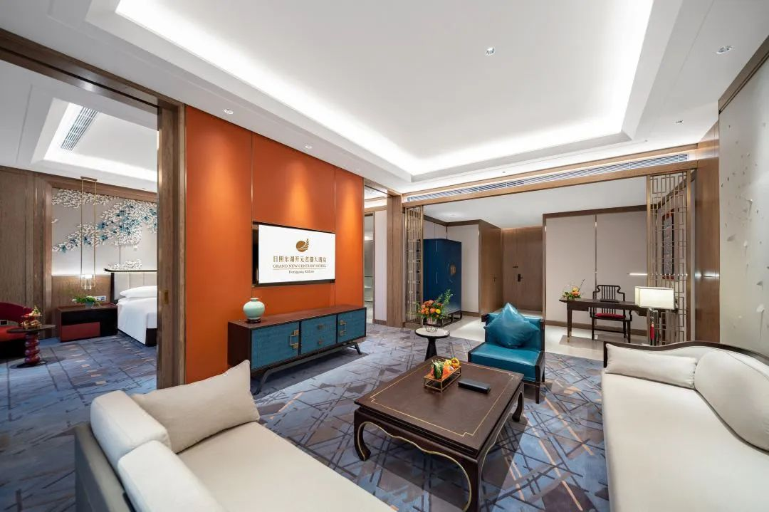 ? ? 純木的家具,充分體現(xiàn)材料的肌理,讓空間營(yíng)造一種舒適溫馨的氛圍,透過(guò)窗外的暖陽(yáng),借著屋內(nèi)的燈光,溫馨中帶著一絲柔和,使整個(gè)房間顯得既寬敞又舒適。地面上規(guī)整的幾何圖案和不斷延伸著的線條,沉穩(wěn)中不失俏皮,地毯沉靜的藍(lán)灰色,與酒店標(biāo)志性橙黃色搭配,風(fēng)格空間的視覺效果。