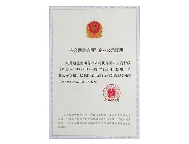? ? 近日獲悉,我公司再次被國家工商總局授予2014—2015年度“全國守合同重信用企業(yè)”稱號。這是東升地毯集團繼2003年首次被認定后連續(xù)13年獲此殊榮。